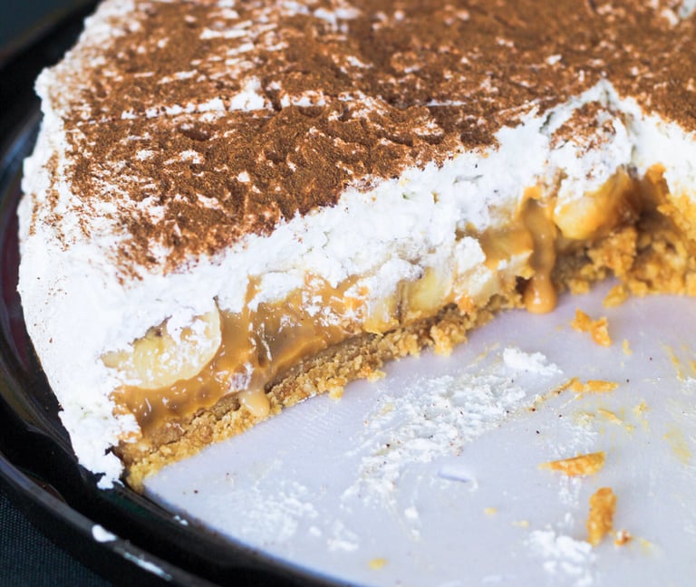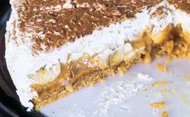 A inconfundível, suculenta e mais saborosa banoffee. Com uma base tradicional de biscoito com uma camada do melhor doce de leite, uma camada de banana in natura, coberto com nosso incrível chantininho, com de limão siciliano e polvilhado com especiarias e raspas de limão. Finalizado com uma linda decoração natalina.