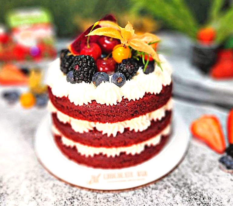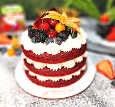 Deliciosa e clássica massa vermelha sabor baunilha com um toque de cacau, umedecida com uma calda de especiarias, recheado e coberto pelo clássico cream cheese, também recheada com uma mousse sabor frutas vermelhas azedinha e a melhor geléia de frutas vermelhas, sendo decorada com saborosas e nobres frutas vermelhas da estação.